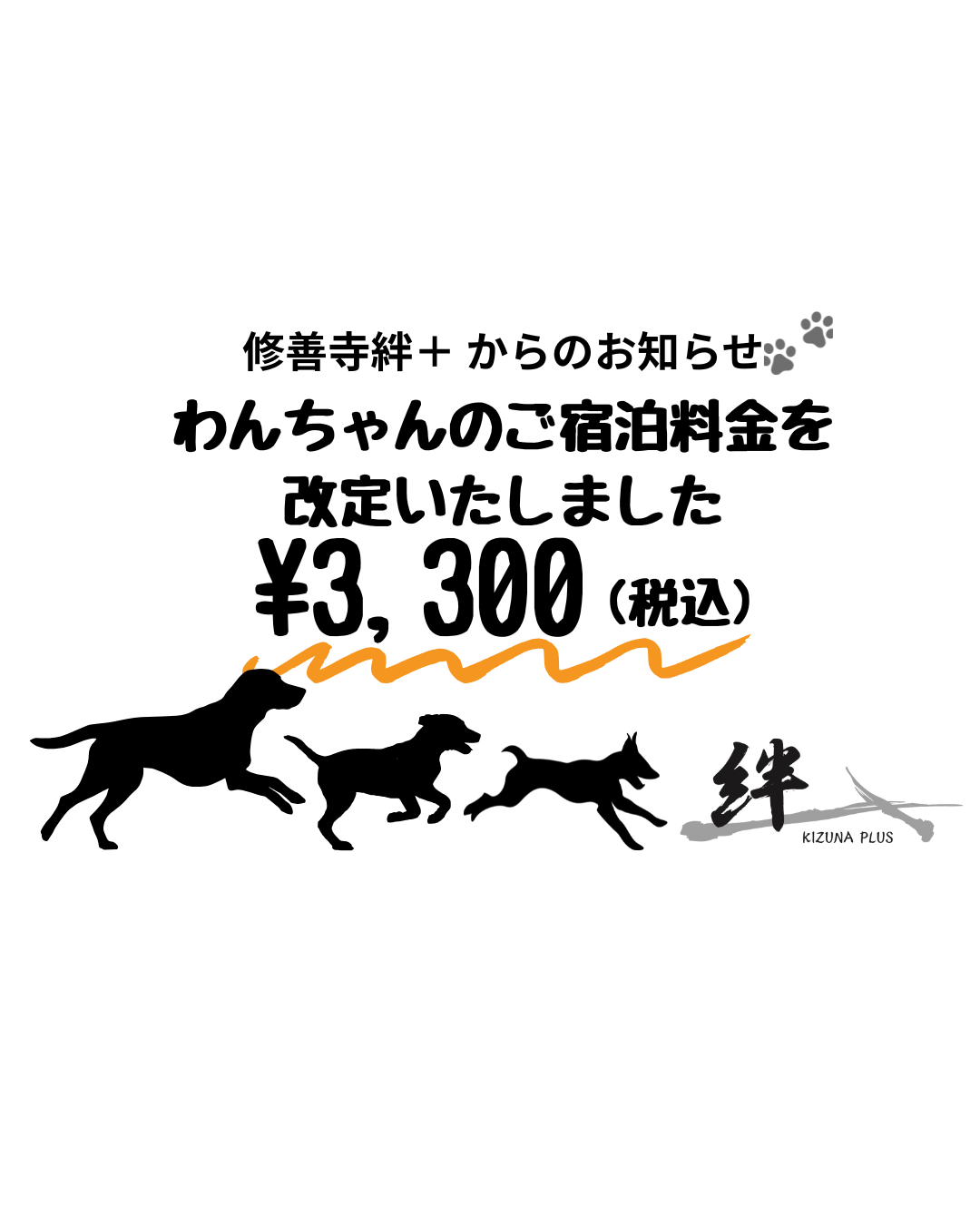 愛犬ご宿泊料金改定のお知らせ 2026.01.16 いつも修善寺絆+にお越しいただきありがとうございます。 2026年1月12日(月)より、愛犬のご宿泊料金を改定いたしました。 1頭につき、3,300円(税込)でございます。 みなさまのお越しを心よりお待ちしております。 前のページへ戻る